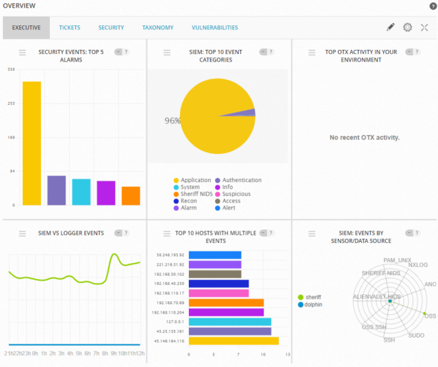 Overview > Executive display shows various “widgets” (charts, tables, and graphs) that summarize various aspects of network security and other status, activities, and events occurring in your network. Additional options from the Overview page provide dashboard displays for Tickets, Security, Taxonomy, and Vulnerabilities.
